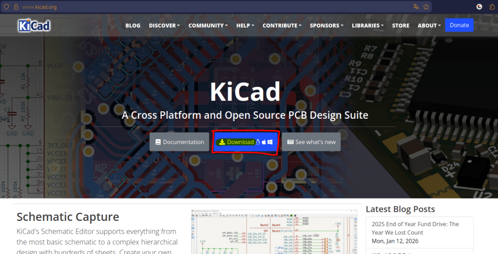 - Otevřete váš weboví prohlížeč a jděte na oficiální web KiCadu(www.kicad.org)