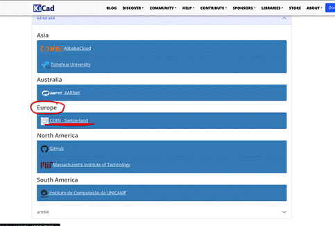 - Zobrazí se seznam různých verzí KiCadu podle světadílu ve kterém se nacházíte. Pro příklad vybereme Evropu, tedy odkaz s názvem ,,CERN – Switzerland” pod nadpisem Europe (Evropa)
