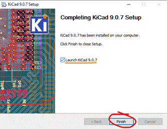 - Po dokončení instalace jen klikněte znovu na ,,Next” a následně zaškrtněte políčko ,,Launch KiCad” pokud chcete, aby se vám KiCad po zavření instalačního skriptu spustil.