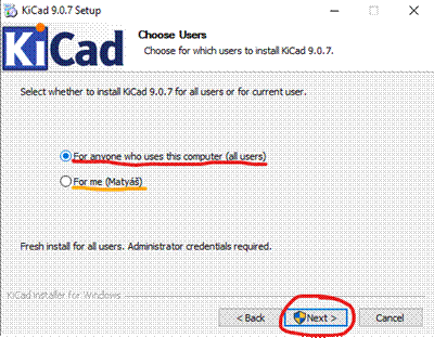 - Nyní budete vyzváni, jestli chcete aby byl nainstalovaný KiCad přístupný pro všechny uživatele na vašem počítači, nebo jen pro aktuálního uživatele. Zvolte vám vyhovující možnost a klikněte na ,,Next” (Další)