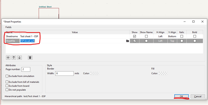 - Jakmile vše vyplníte, klikněte na tlačítko OK v okně a v panelu vlevo a dole by se měl zobrazit sheet s vámi zvoleným jménem. Tímto způsobem můžete vždy, když přidáte nové čidlo s větším zapojením, kliknout v tom samém panelu s jednotlivými sheety na “Root (page 1)” a vytvořit v něm nový sheet a mít tak váš projekt hezky přehledný.
