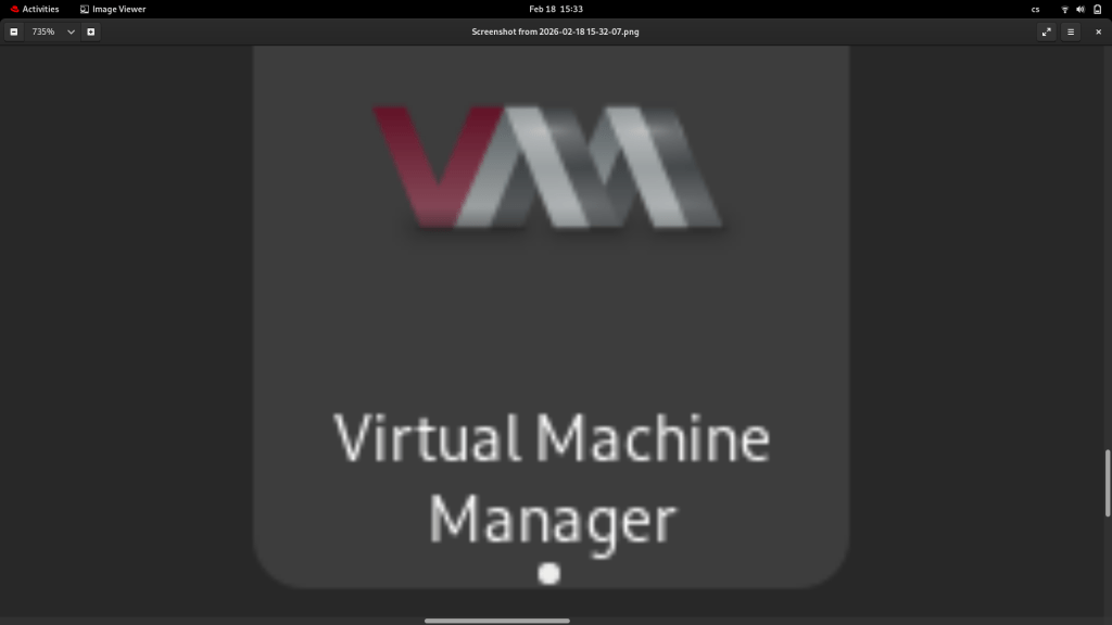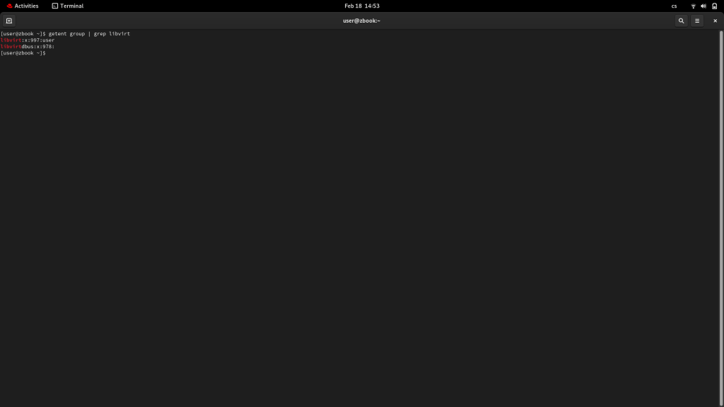Jak už bylo zmíněno dříve, tak KVM je sice součástí Linuxu, ale né vždy je v aktivním stavu. Což znamené, že si potřebujeme otevřít terminál, Začneme tím, že si ověříme existenci systémové skupiny „libvirt“ na tvém zařízení.